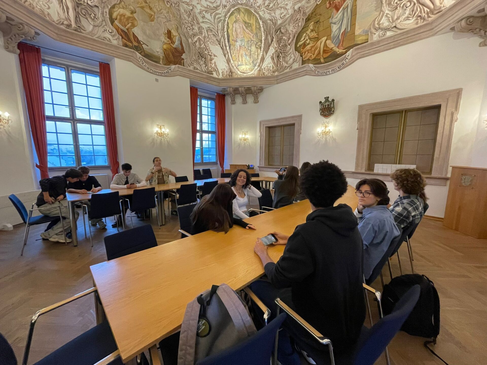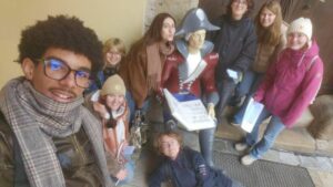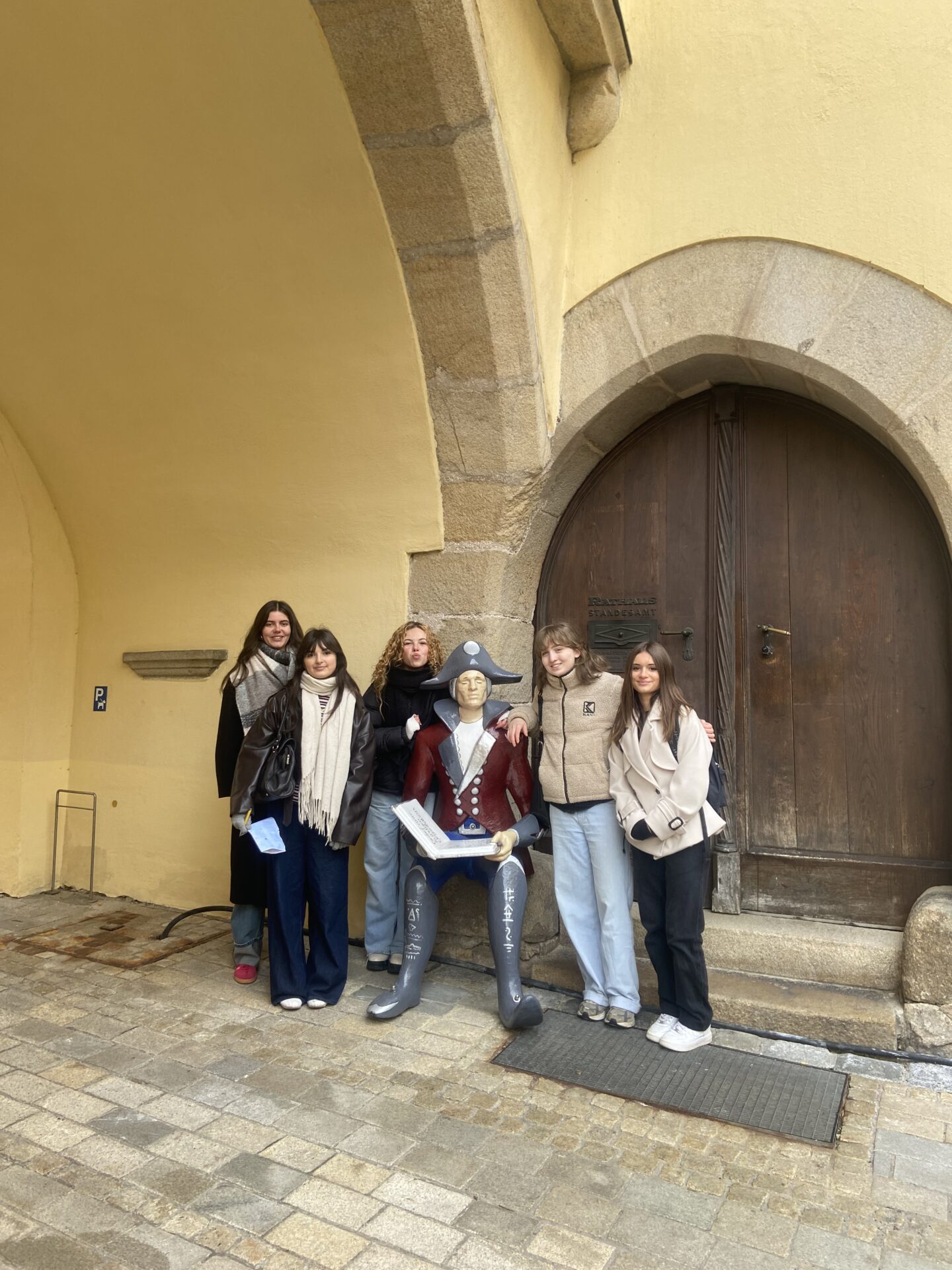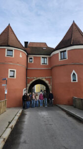 Kaum angekommen, hieß es am Dienstag: en route! – und zwar zunächst nach Cham. Dort wandelten die Jugendlichen bei einer unterhaltsamen Stadtallye auf den Spuren des Grafen Luckner, eines waschechten Chamers, der im 18. Jahrhundert in der französischen Armee Karriere machte. Schließlich wurde ihm vom Verfasser sogar die französische Nationalhymne gewidmet. Besonderes Highlight war daher die Marseillaise, die täglich um 12.05 Uhr im Glockenspiel des Chamer Rathauses zu Ehren des Marschalls ertönt. Natürlich ließen es sich die französischen Gastschüler hier nicht nehmen, lautstark mitzusingen. Anschließend führte der Weg nach Regensburg, wo die deutsch-französische Gruppe ihre gemeinsamen römischen Wurzeln entdeckte und zusammen mit der Stadtmaus auch das mittelalterliche Regensburg erkundete.
