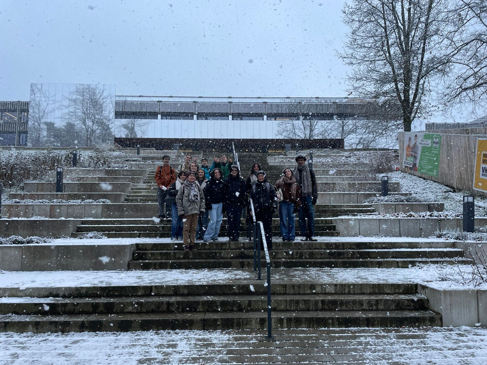 Beim Besuch im Landratsamt am darauffolgenden Tag begrüßte Landrat Andreas Meier die Gäste aus Bressuire herzlich und lobte das Engagement beider Schulen für den europäischen Austausch. Meier betonte dabei die Bedeutung des europäischen Miteinanders gerade in heutiger Zeit und forderte die Schülerinnen und Schüler dazu auf, sich trotz – oder gerade wegen – ihres jungen Alters auch jenseits des Austauschs sozial und politisch einzusetzen. Der Weg zurück vom Landratsamt zur Schule bot dann eine besondere Überraschung für die französischen Gäste aus dem etwas wärmeren Südwesten Frankreichs: Schnee! Die Jugendlichen waren von der weißen Pracht so begeistert, dass viele überlegten, ihren Aufenthalt noch bis Weihnachten zu verlängern.