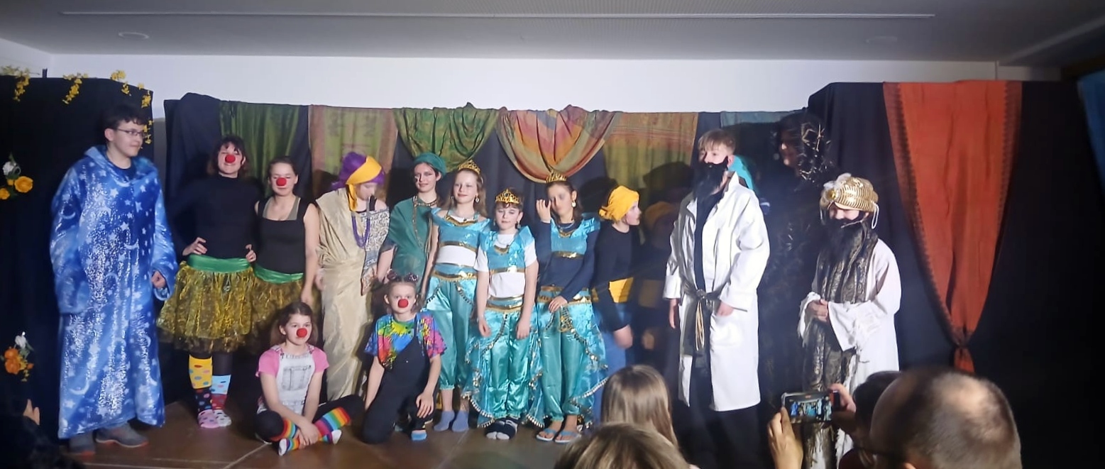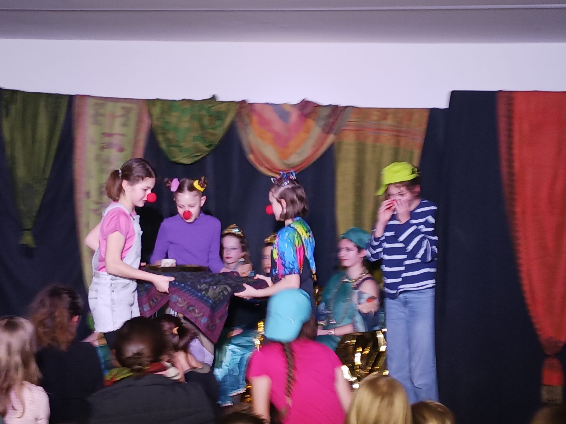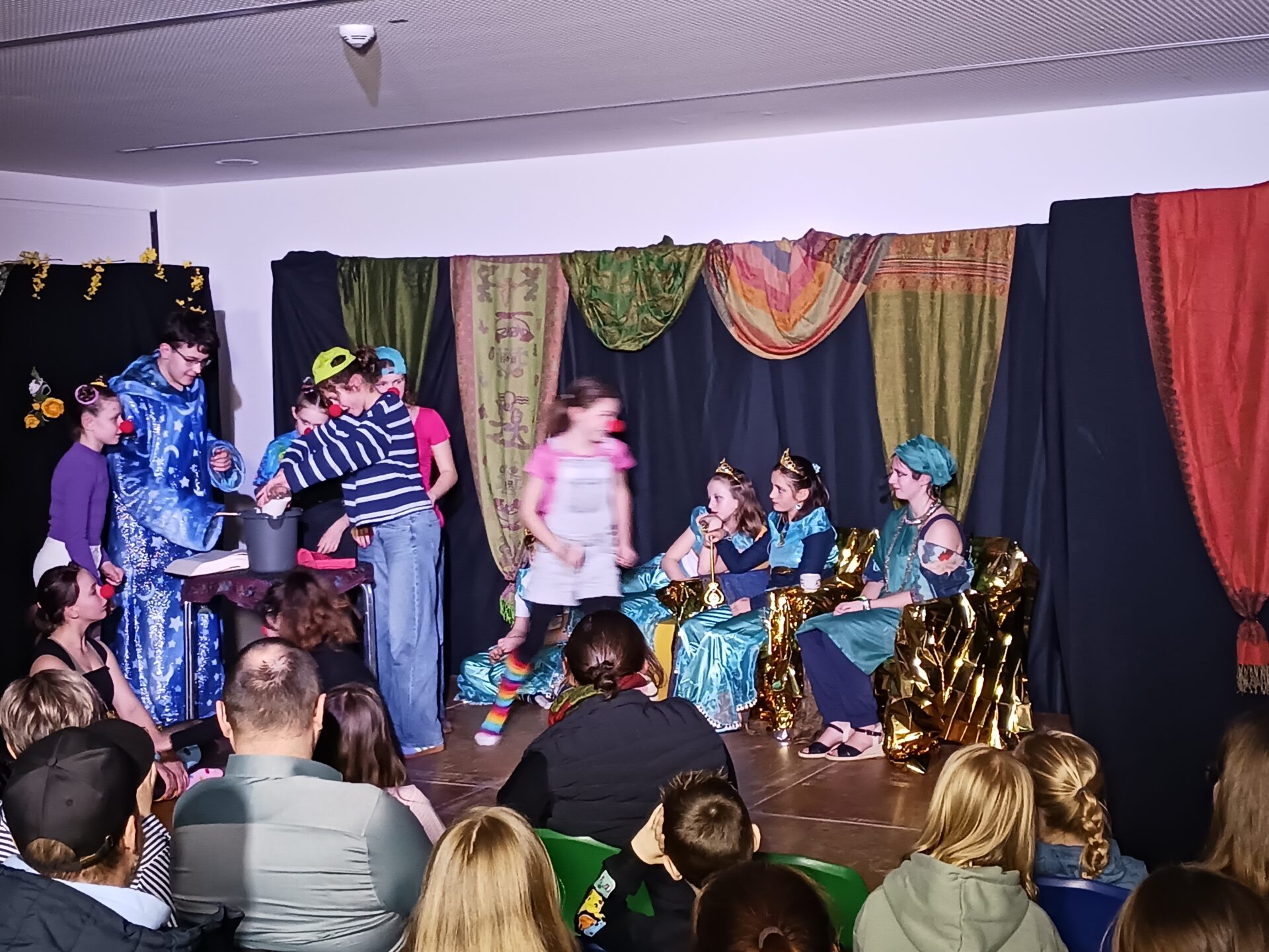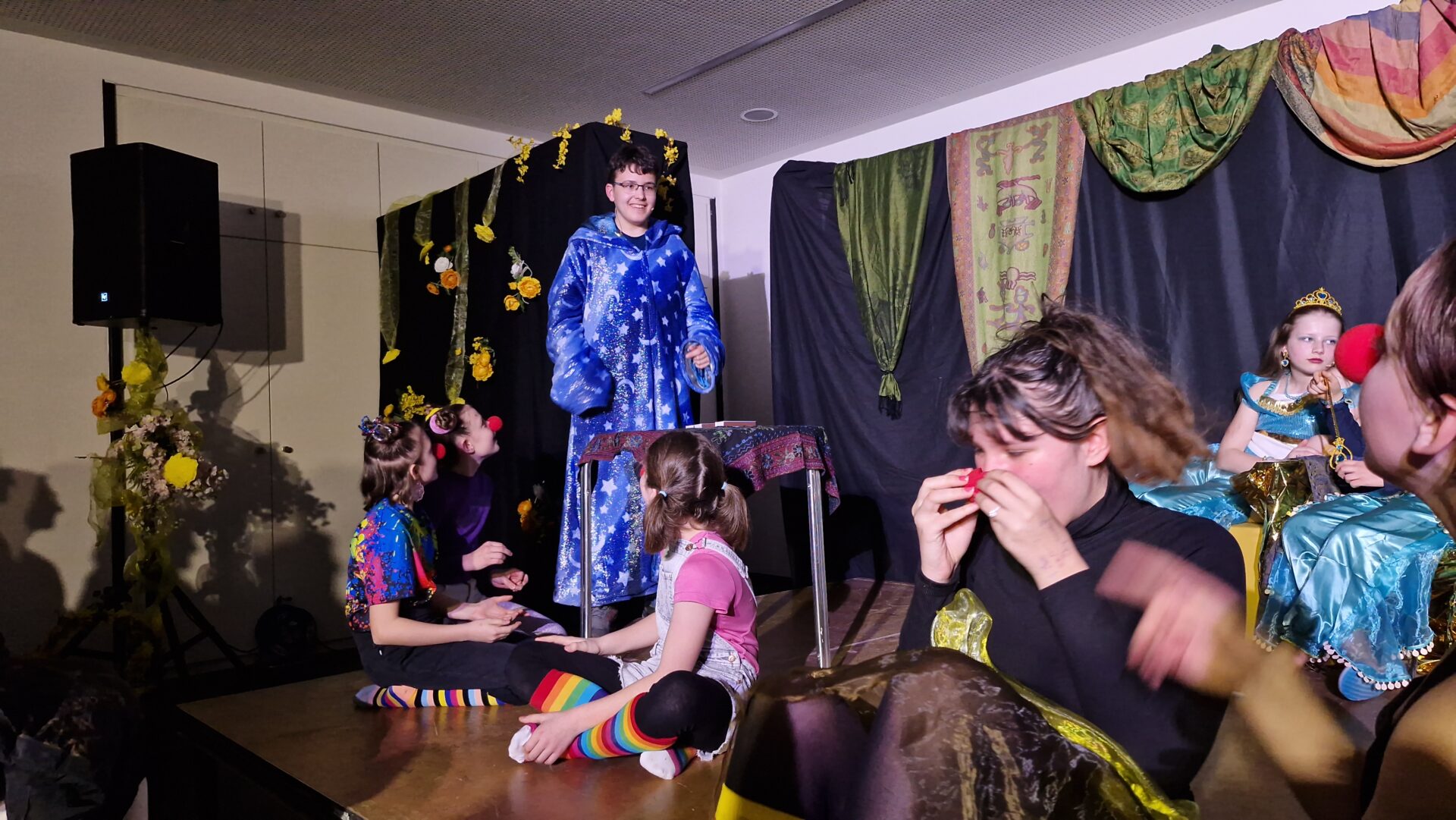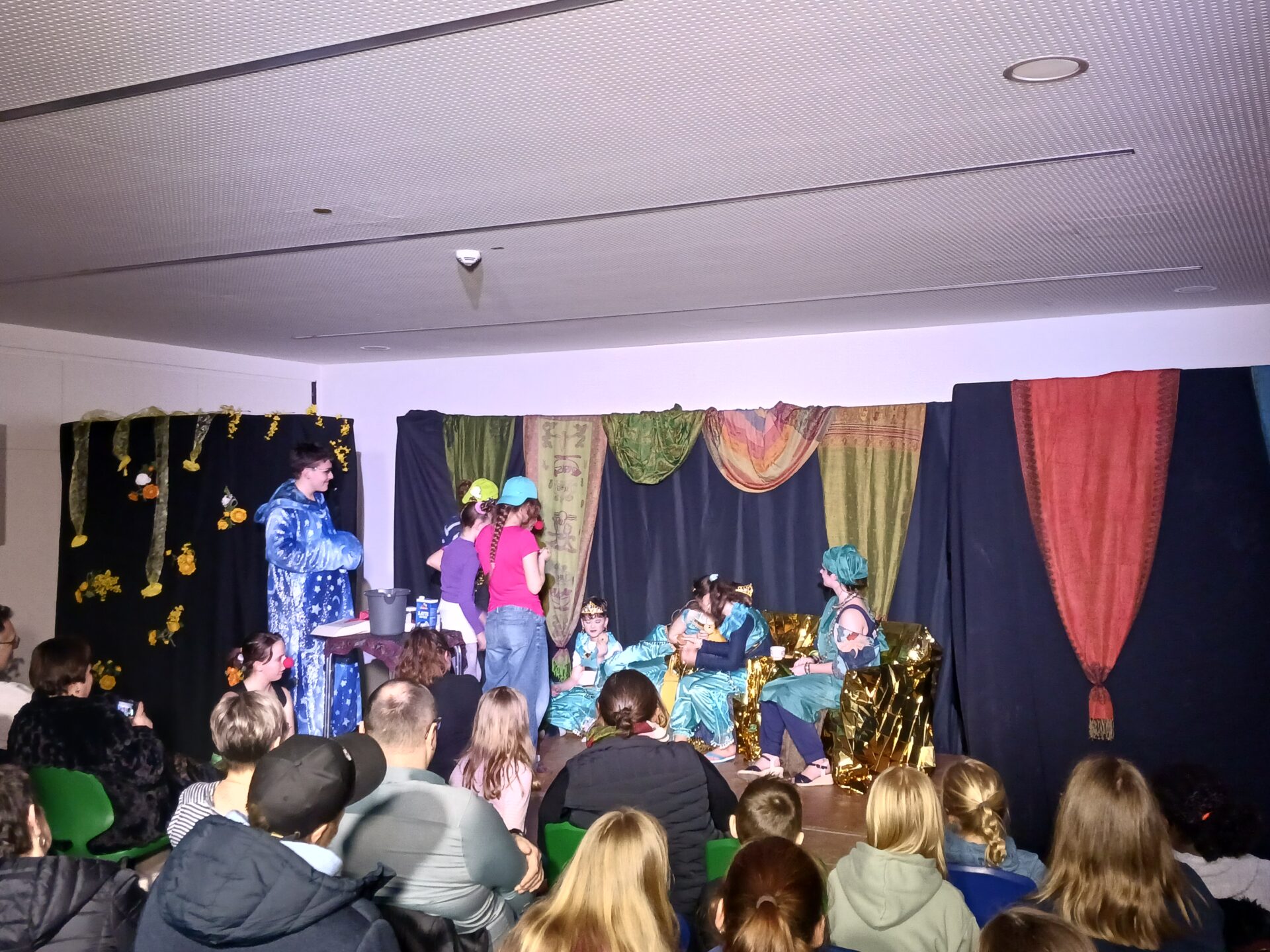Im Georaum verwandelte sich die Bühne in eine bunte Zirkuswelt: Mit liebevoll gestalteten Szenen erzählten die Schülerinnen und Schüler die Geschichte von drei Prinzessinnen am Hof eines Sultans, die ihr Lachen verloren haben. Mit artistischen Einlagen, humorvollen Momenten und viel Fantasie gelang es den Darstellerinnen und Darstellern, das Publikum mitzunehmen – und am Ende auch den Figuren auf der Bühne das Lachen zurückzugeben. Eine ganz besondere Rolle spielten dabei die legendären „Lachkekse“ – im Stück die ebenso einfache wie geniale Lösung für (fast) jedes Problem. Wir versuchen gerade noch, dem Zauberer das Rezept zu entlocken…
