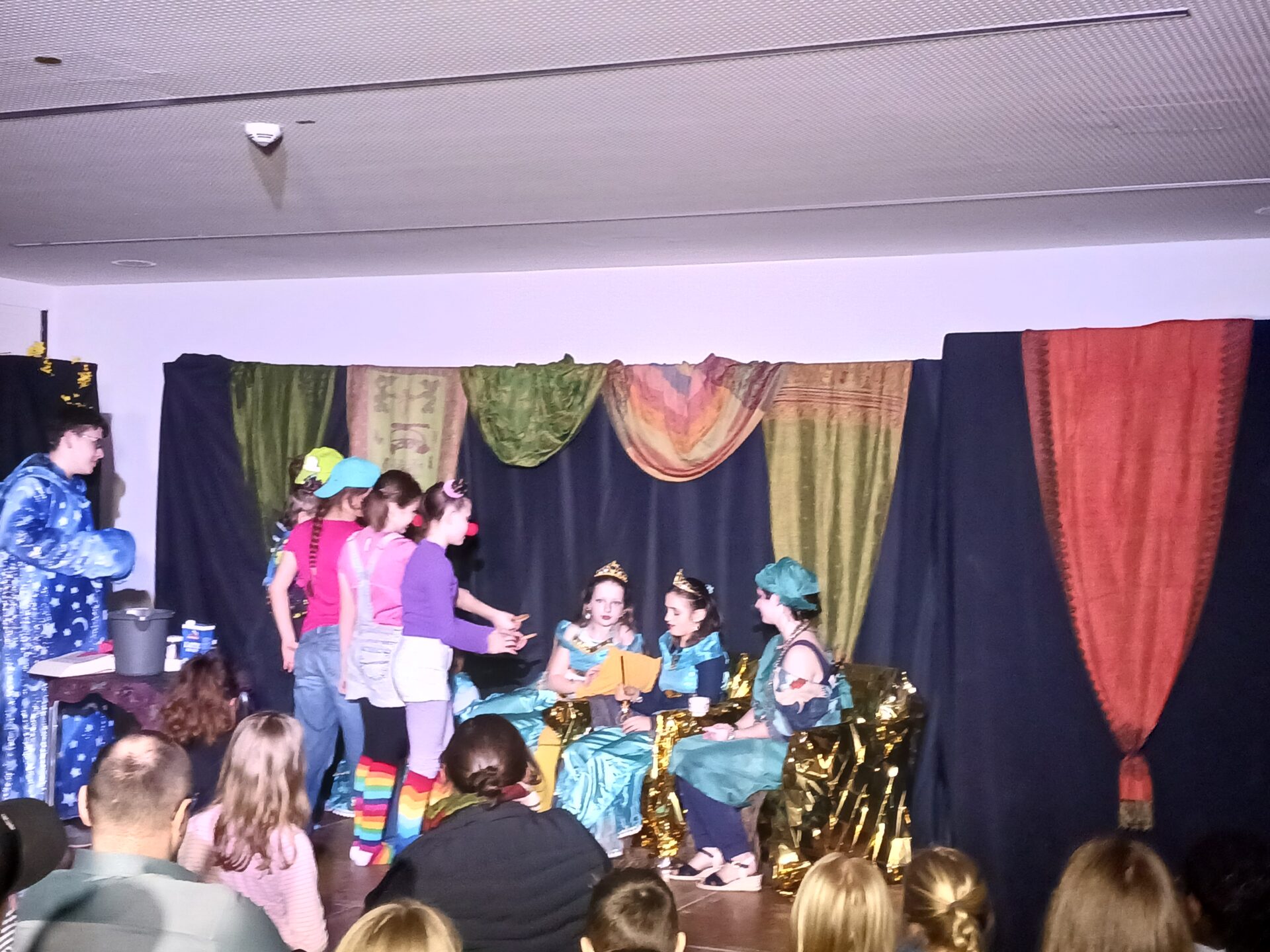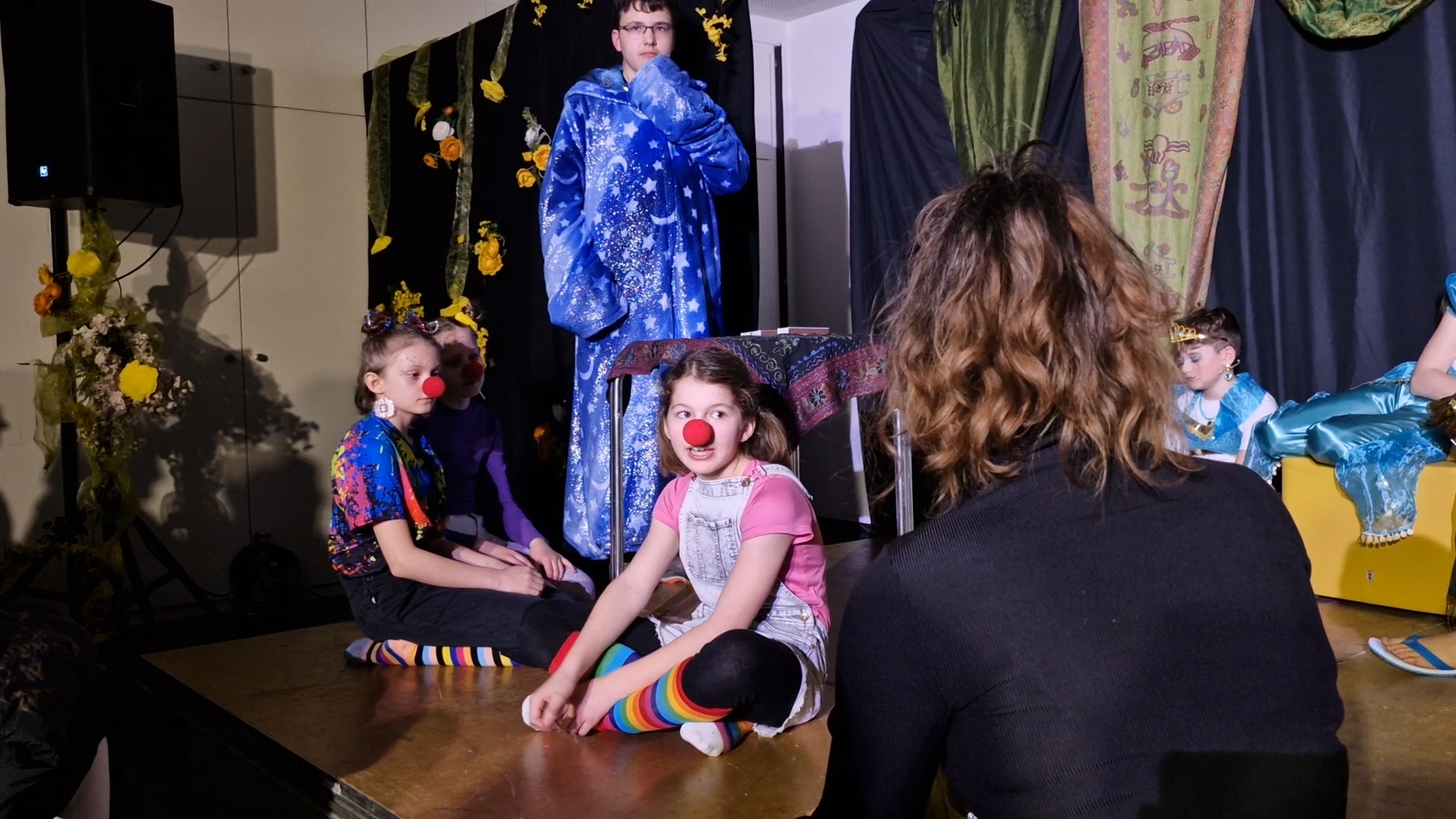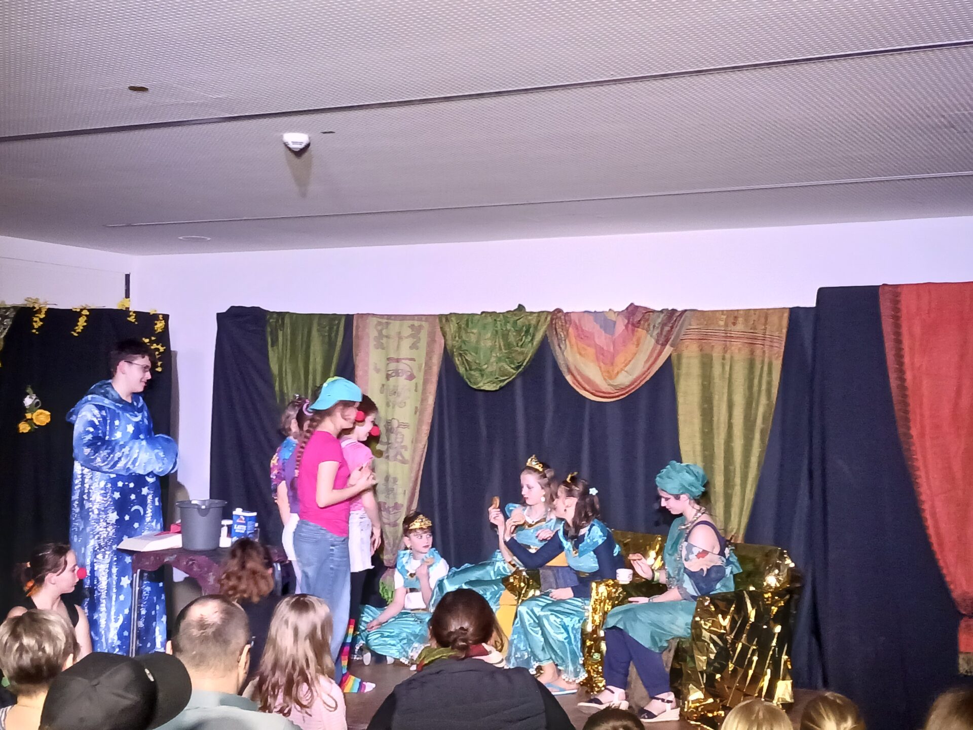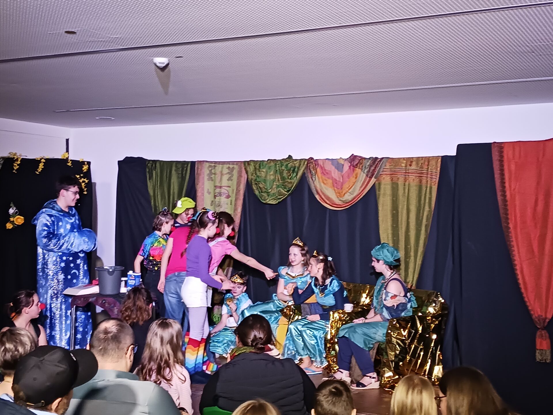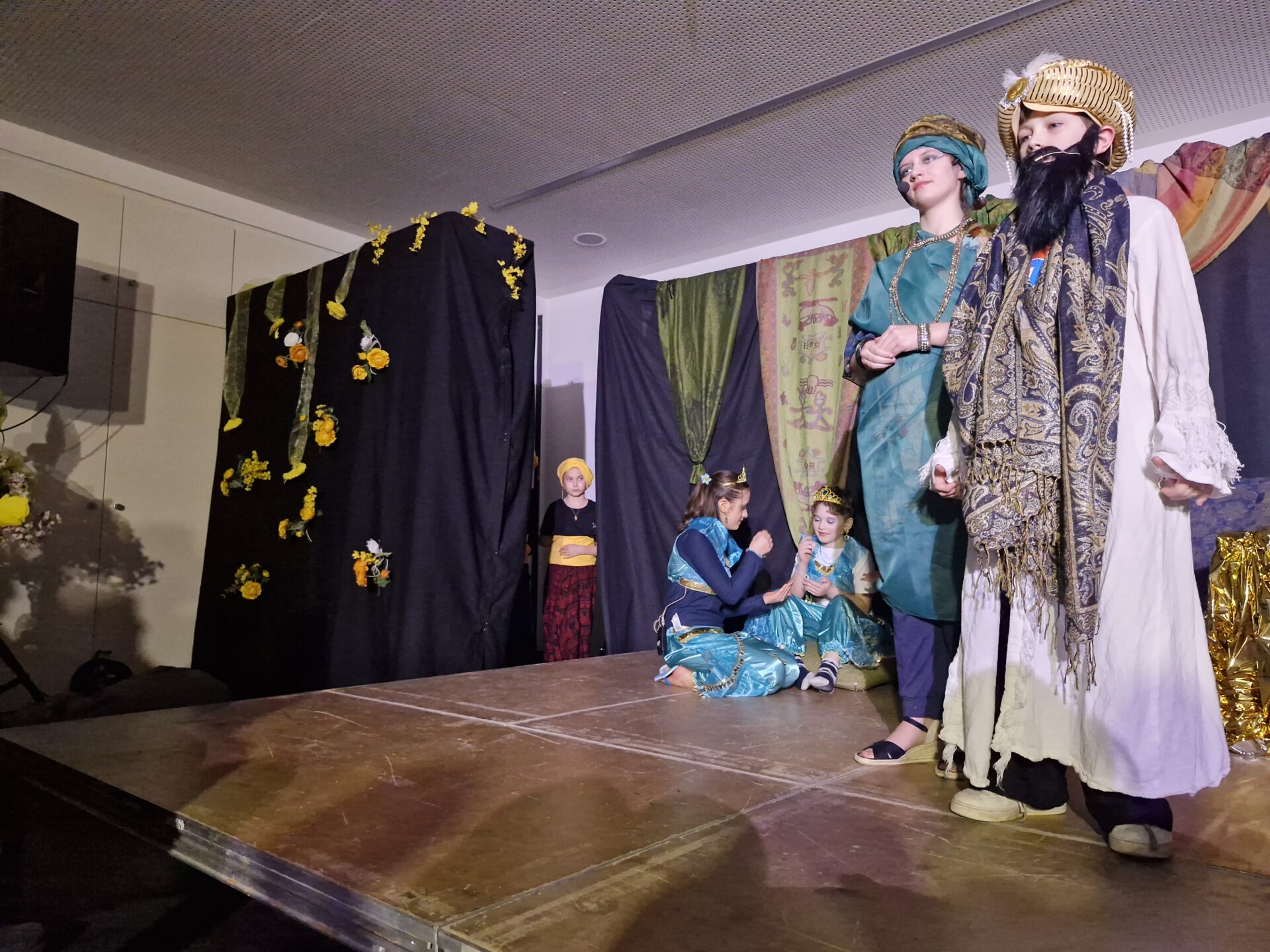 Im Georaum verwandelte sich die Bühne in eine bunte Zirkuswelt: Mit liebevoll gestalteten Szenen erzählten die Schülerinnen und Schüler die Geschichte von drei Prinzessinnen am Hof eines Sultans, die ihr Lachen verloren haben. Mit artistischen Einlagen, humorvollen Momenten und viel Fantasie gelang es den Darstellerinnen und Darstellern, das Publikum mitzunehmen – und am Ende auch den Figuren auf der Bühne das Lachen zurückzugeben. Eine ganz besondere Rolle spielten dabei die legendären „Lachkekse“ – im Stück die ebenso einfache wie geniale Lösung für (fast) jedes Problem. Wir versuchen gerade noch, dem Zauberer das Rezept zu entlocken…