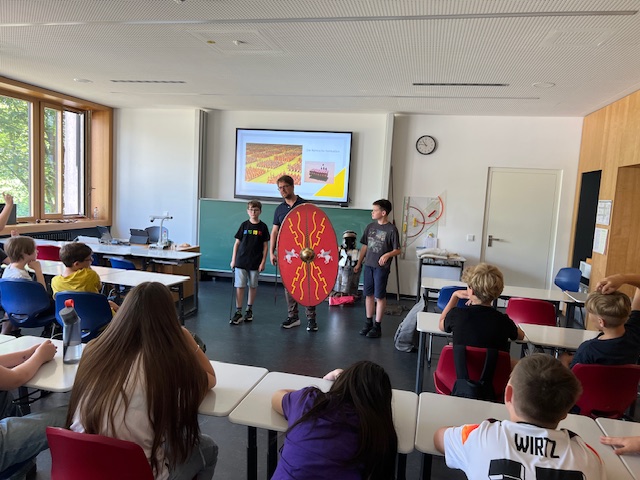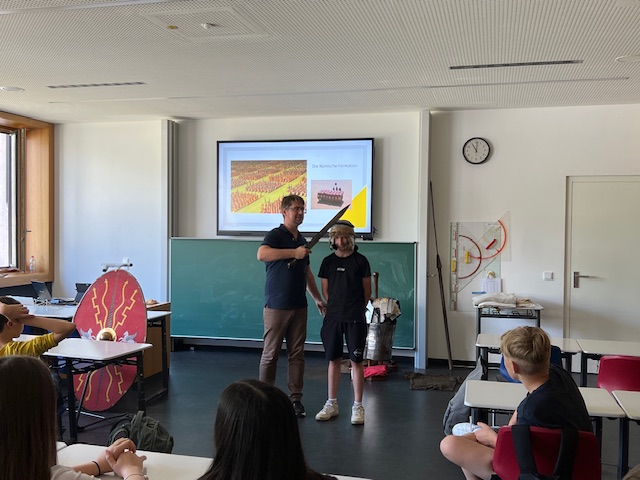 - der Römertag der 6. Klassen, bei dem wir einmal jährlich die verschiedensten Aktivitäten anbieten. So haben wir etwa schon Brot nach originalrömischem Rezept gebacken, Mosaike hergestellt, Ausflüge ins römische Regensburg unternommen oder eine Lesung mit dem Jugendbuchautoren Fabian Lenk organisiert.