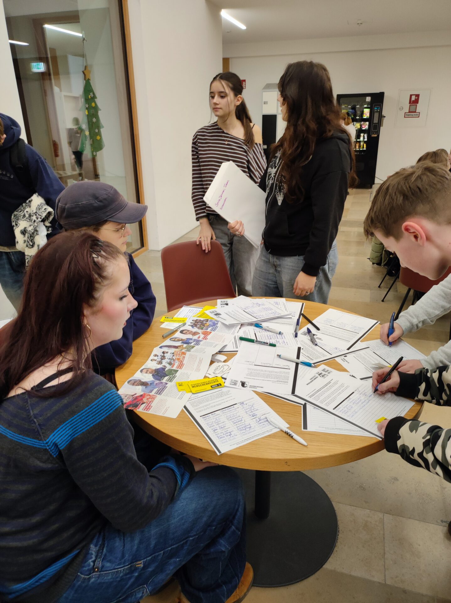 Im Zuge des Internationalen Tags der Menschenrechte am 10. Dezember rief der Wahlkurs „Schule ohne Rassismus. Schule mit Courage“ die gesamte Schulgemeinschaft zusammen, um sich an der größten Menschenrechtsaktion der Welt zu beteiligen. Schülerinnen und Schüler kamen in der Pause vor die Bibliothek, um ihre Unterschriften auf Petitionslisten zu setzen, welche Druck auf Regierungen und Behörden ausüben sollen, damit Unrecht und Menschenrechtsverletzungen weltweit beendet werden. Interessierte Kinder und Jugendliche wurden dort auch von den Mitgliedern des Wahlkurses über die betroffenen Personen und deren Schicksal informiert.