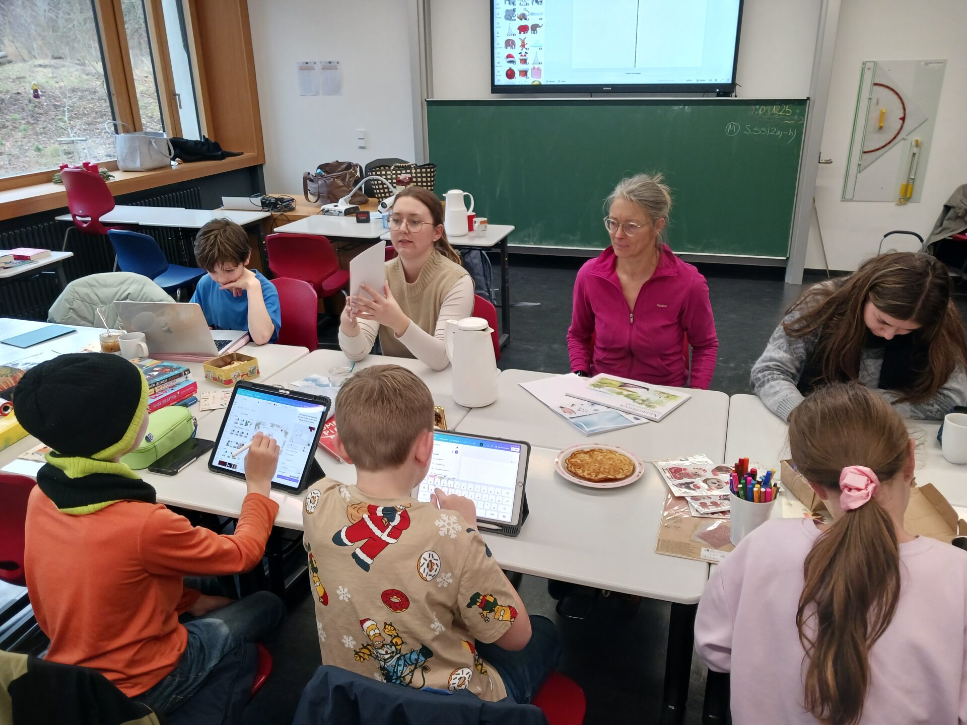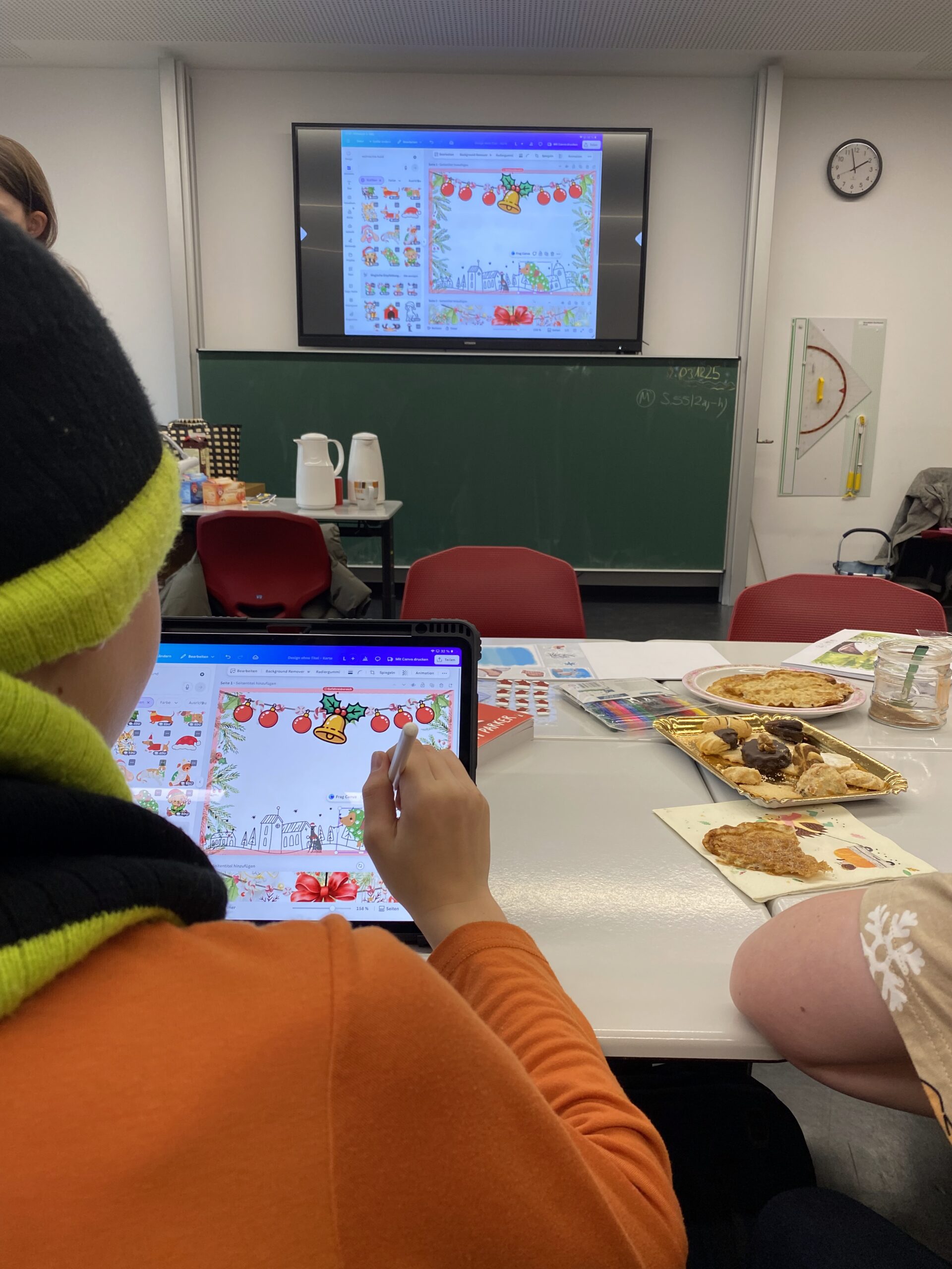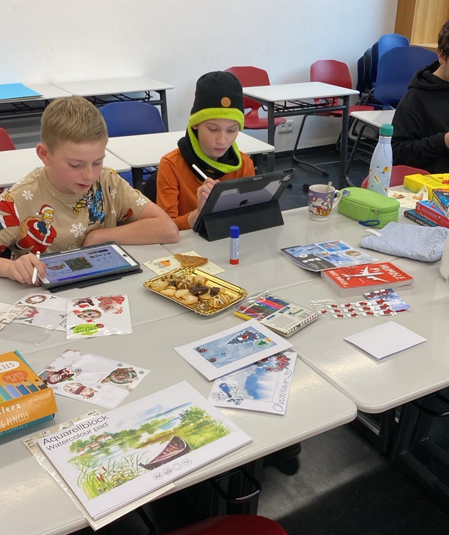 Mit viel Freude gestalteten die Teilnehmenden individuelle Weihnachtskarten. Dabei gab es sowohl digitale als auch analoge Möglichkeiten: Auf Tablets und Laptops konnten die Karten mithilfe der App Canva digital mit Bildern, Abbildungen, Schriftzügen und verschiedenen Gestaltungselementen entworfen werden. Beim Basteln von Hand waren der Kreativität ebenfalls keine Grenzen gesetzt – hier kamen unter anderem ein Airbrush-Stift sowie zahlreiche Sticker und tolle Zeichenkünste zum Einsatz.