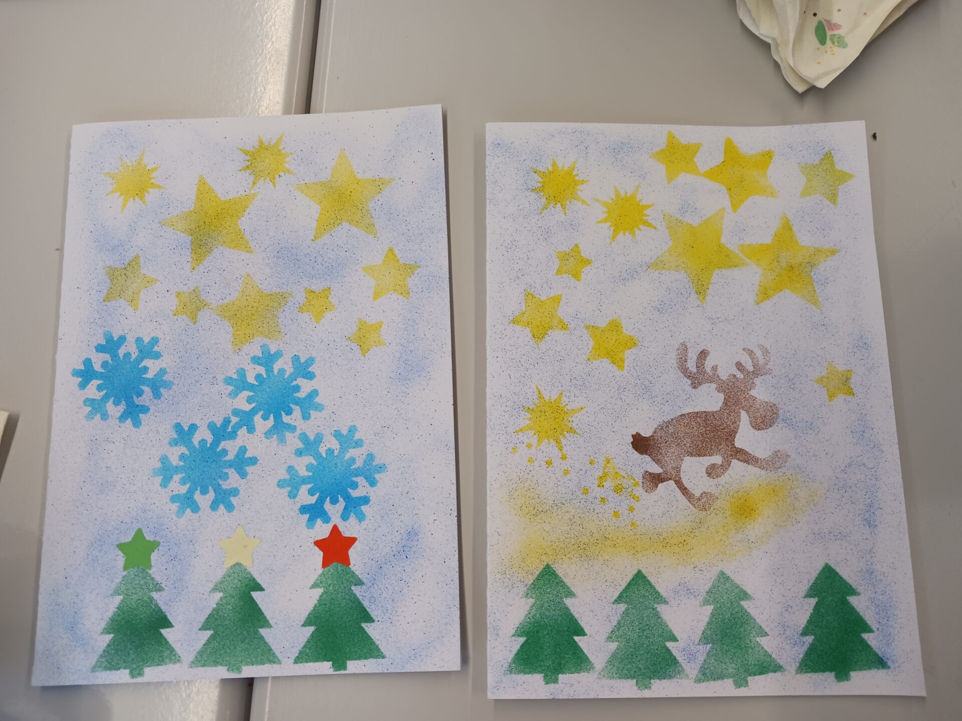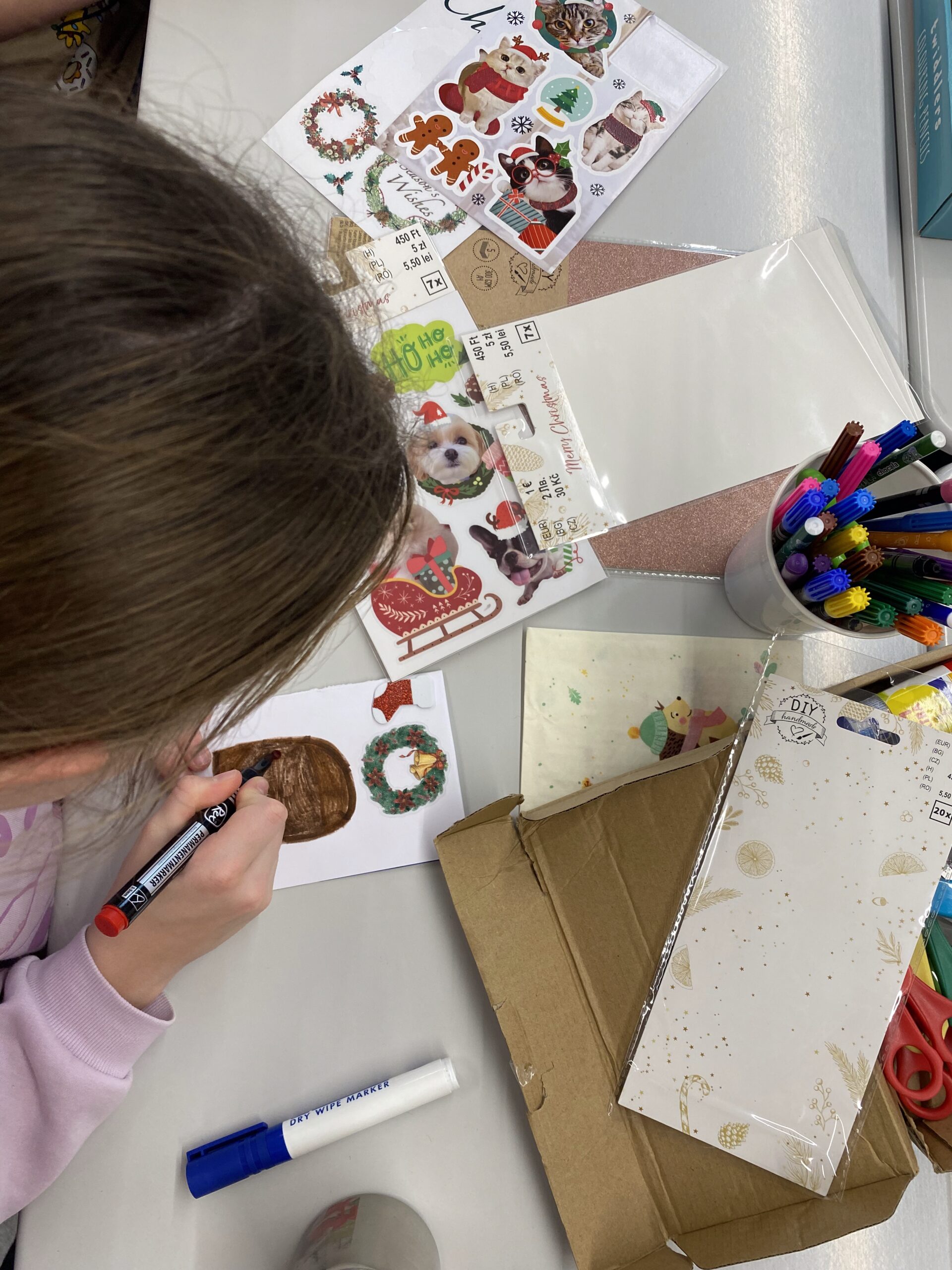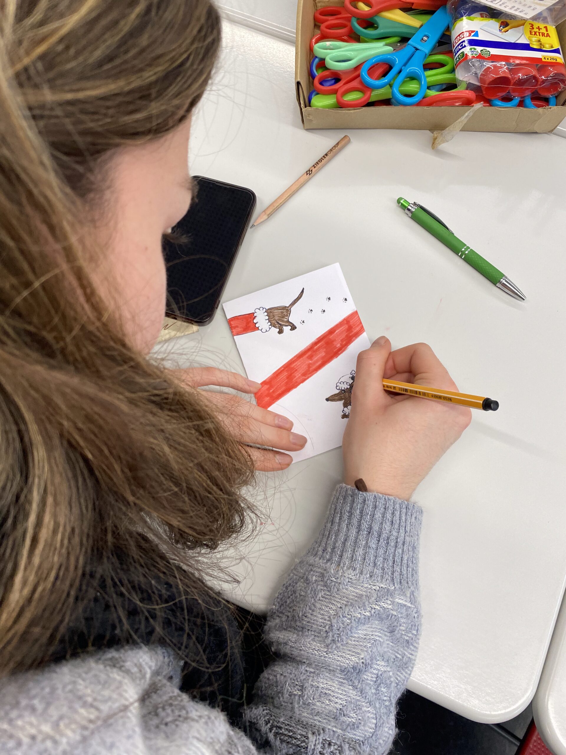 Mit viel Freude gestalteten die Teilnehmenden individuelle Weihnachtskarten. Dabei gab es sowohl digitale als auch analoge Möglichkeiten: Auf Tablets und Laptops konnten die Karten mithilfe der App Canva digital mit Bildern, Abbildungen, Schriftzügen und verschiedenen Gestaltungselementen entworfen werden. Beim Basteln von Hand waren der Kreativität ebenfalls keine Grenzen gesetzt – hier kamen unter anderem ein Airbrush-Stift sowie zahlreiche Sticker und tolle Zeichenkünste zum Einsatz.