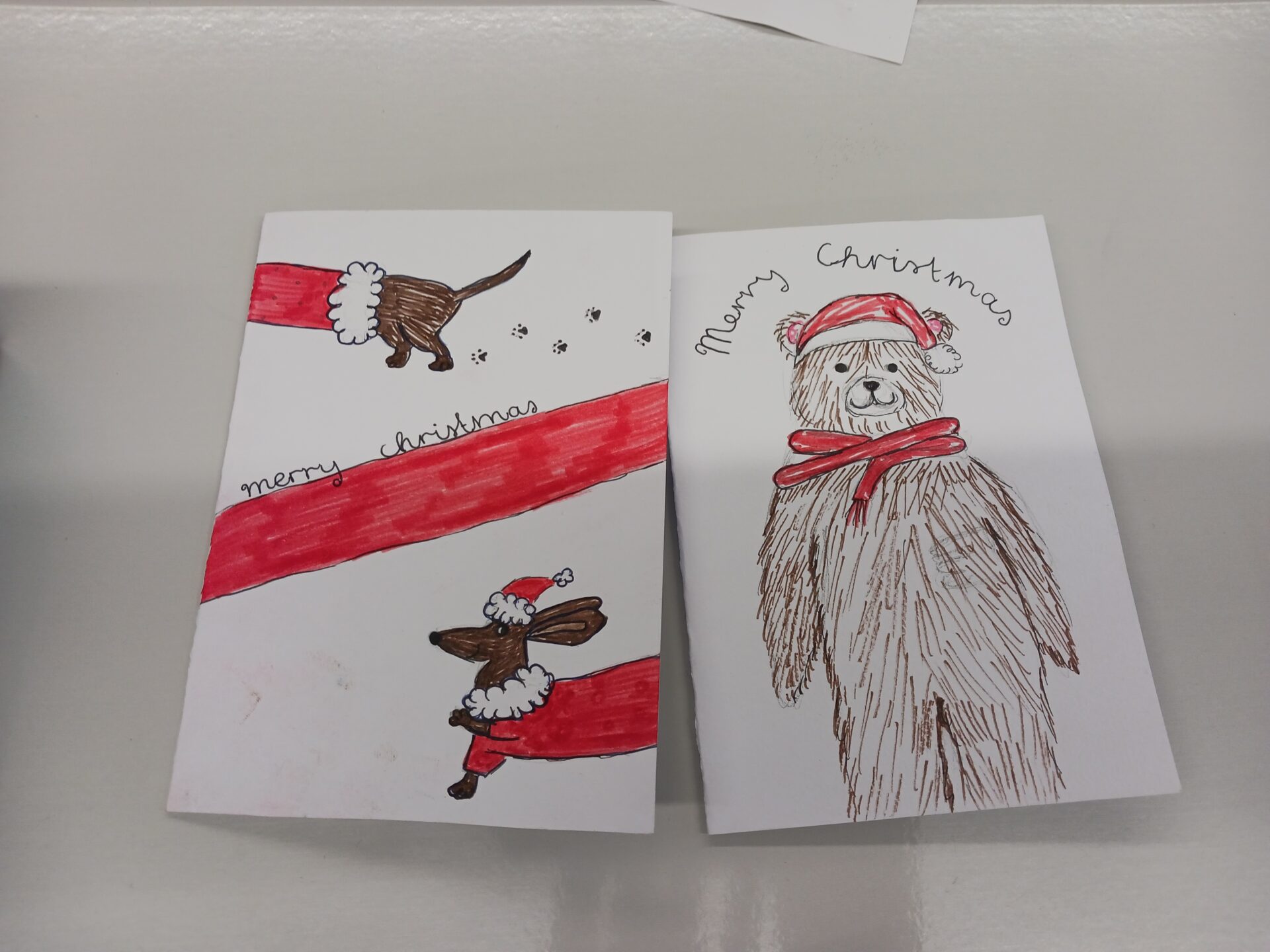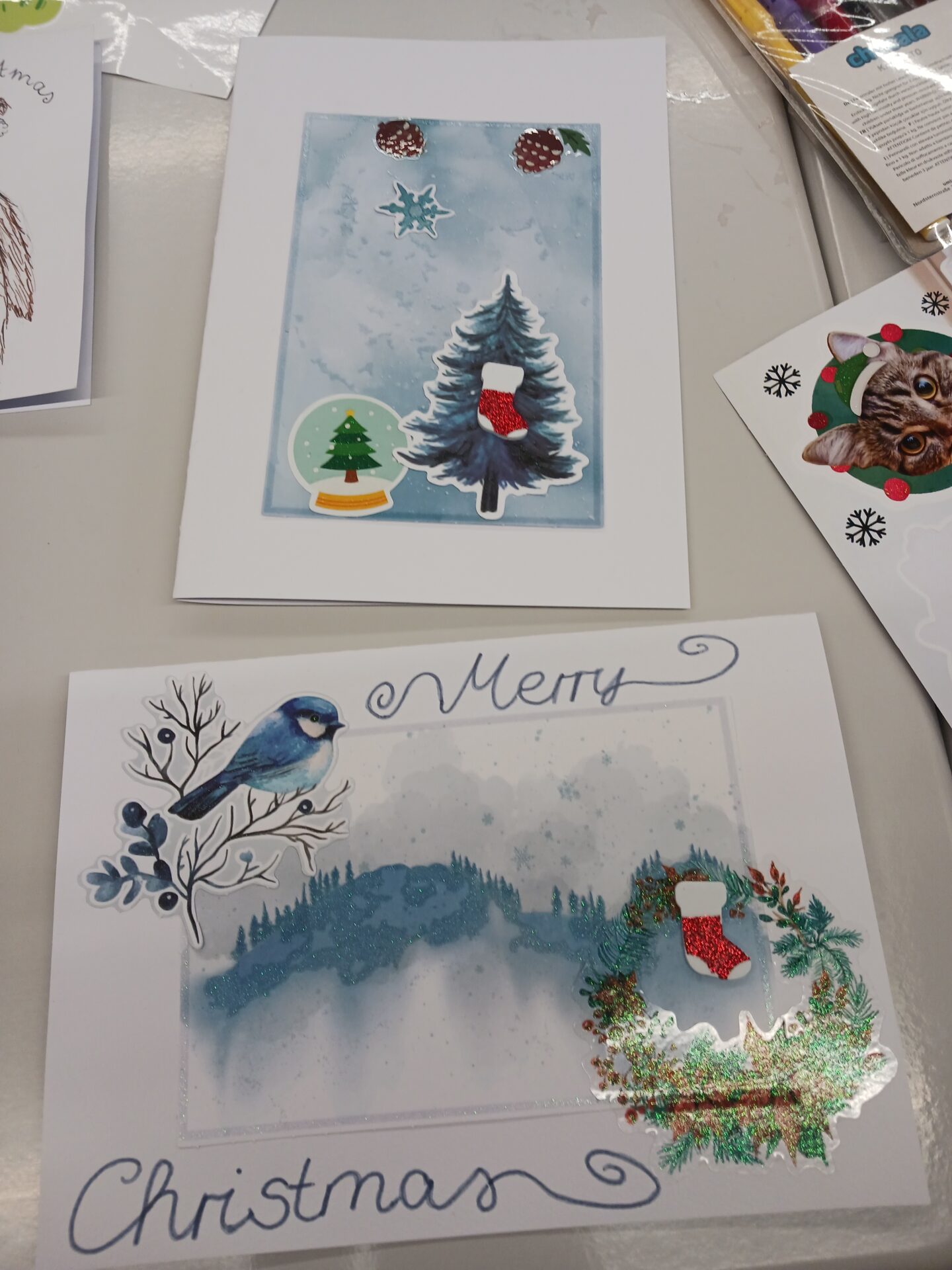 Neben dem kreativen Arbeiten blieb auch genügend Zeit für nette Gespräche und ein gemeinsames Einstimmen auf die Weihnachtszeit. Die selbst gestalteten Karten können zunächst im Schaukasten der Fachschaft Englisch neben dem Sekretariat bewundert und dann am Schüler-Weihnachtsbasar am 19.12. erworben werden. Natürlich durften die Schülerinnen und Schüler ihre eigenen Kunstwerke auch mit nach Hause nehmen, um sie an Familie und Freunde zu verschenken.